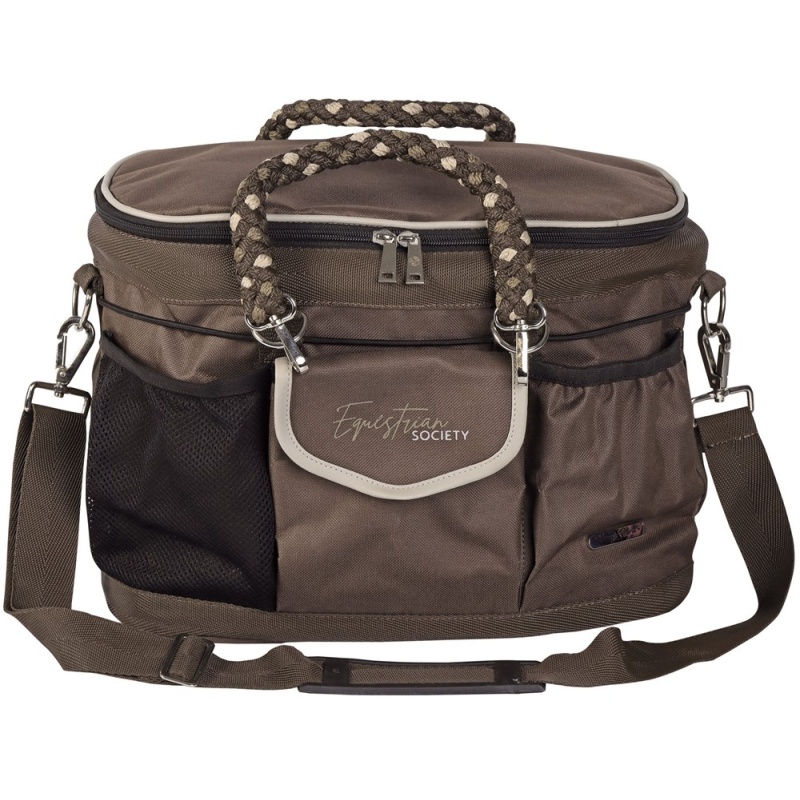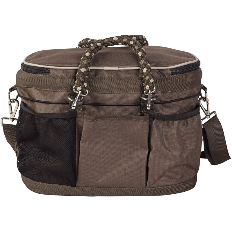 600D polüestrist hoolduskott kunstnahast ääriste ja punutud käepidemega, millel on mitu välistaskut, millest ühel on logoga klapp.