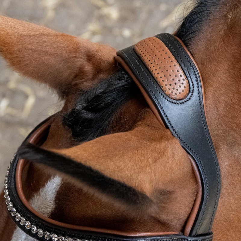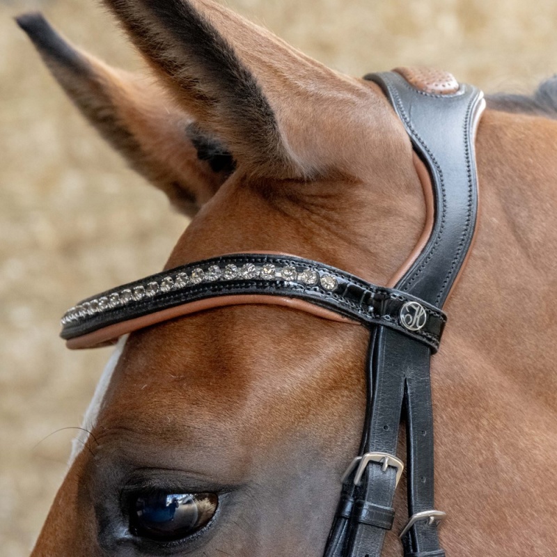 Anatoomilise kujuga kuklarihma ja läikiva kapsliga. Nina- ja otsmikurihm on viimistletud krokodilllakiga. Otsmikurihm on inkrusteeritud konjakivärvi kristallidega ja valjad on polsterdatud konjakivärvi nahaga.